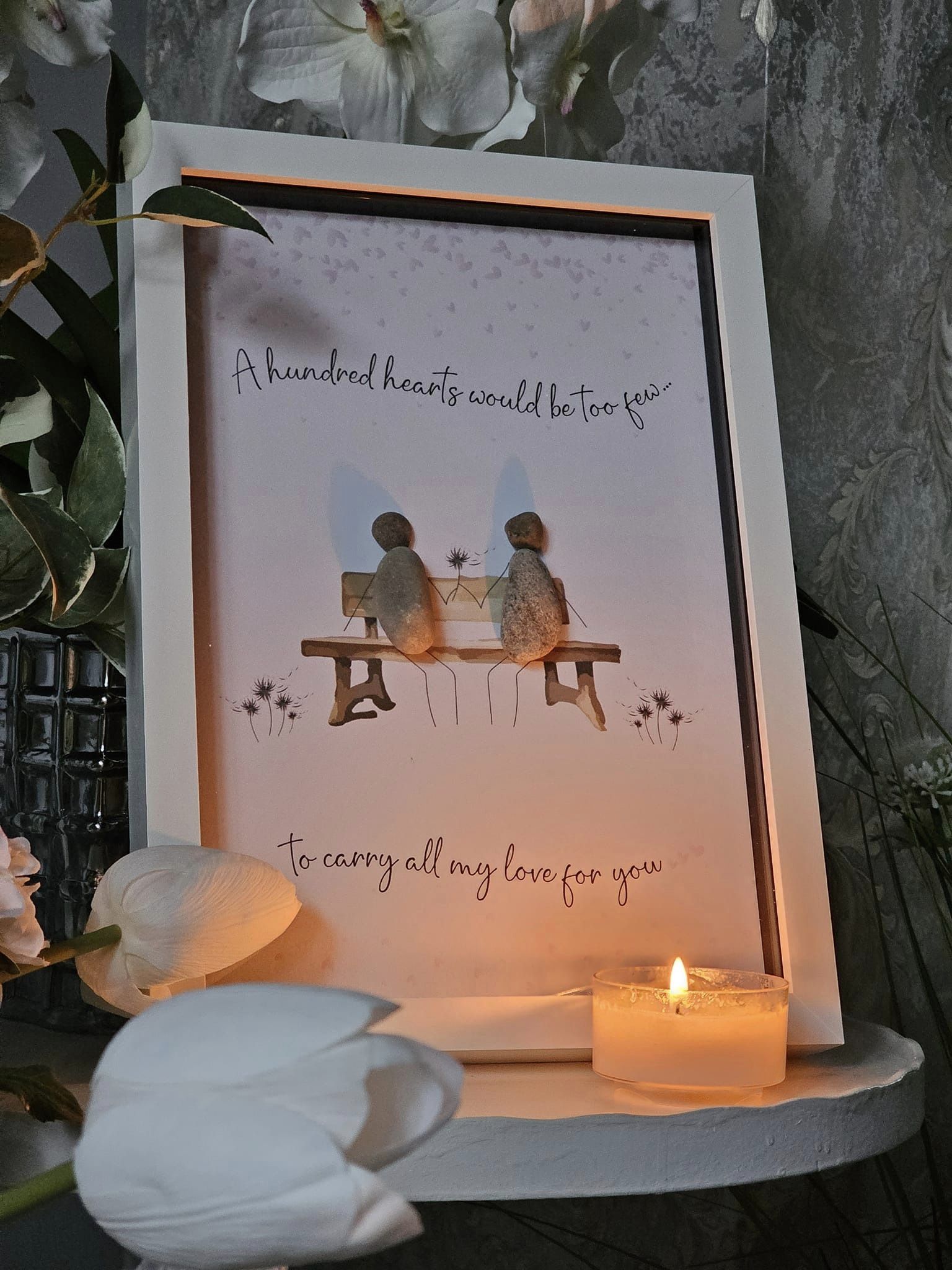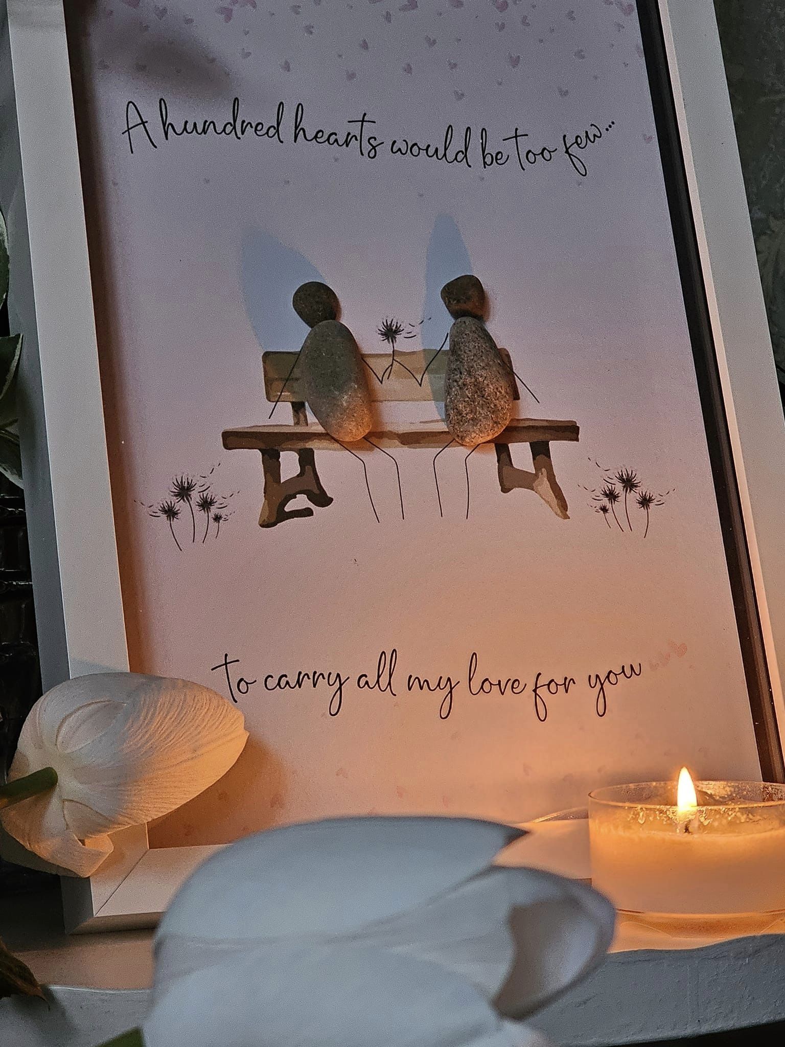 A hundred hearts would be too few to carry all my love for you. A4 Large frame. Our A4 size Pebble Frames have all been exclusively designed. The size of the frame allows a lot more detail to be applied, creating a simply beautiful piece of art. Each frame is individually boxed and is free-standing, easily wall-hung and also has a leaning strut as a third option.