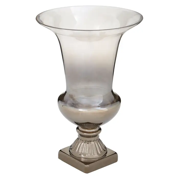 This large ombre glass vase features a timeless design with a curved silhouette and a wide rim. Crafted from glass, the vase rests above a square fluted plinth base that adds texture and furthers the classic sophistication of the design.