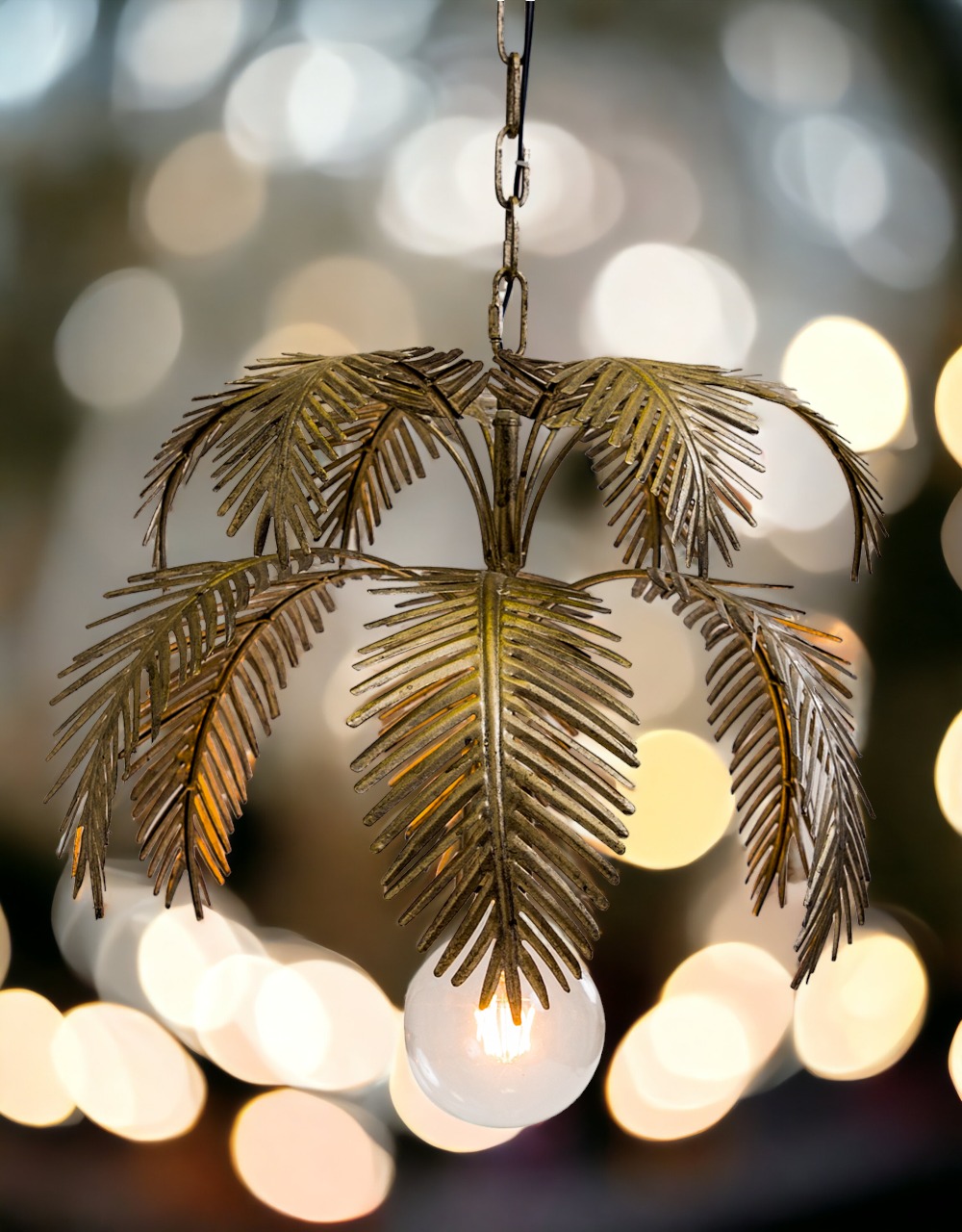 Inject a touch of the tropics into your living space with our fabulous Gold Fern Leaf Chandelier featuring multiple curved metal palm leaves which have been finished in an antique gold finish. Large B22 bulb (not included) Dimensions: H:149cm W:46cm D:46cm