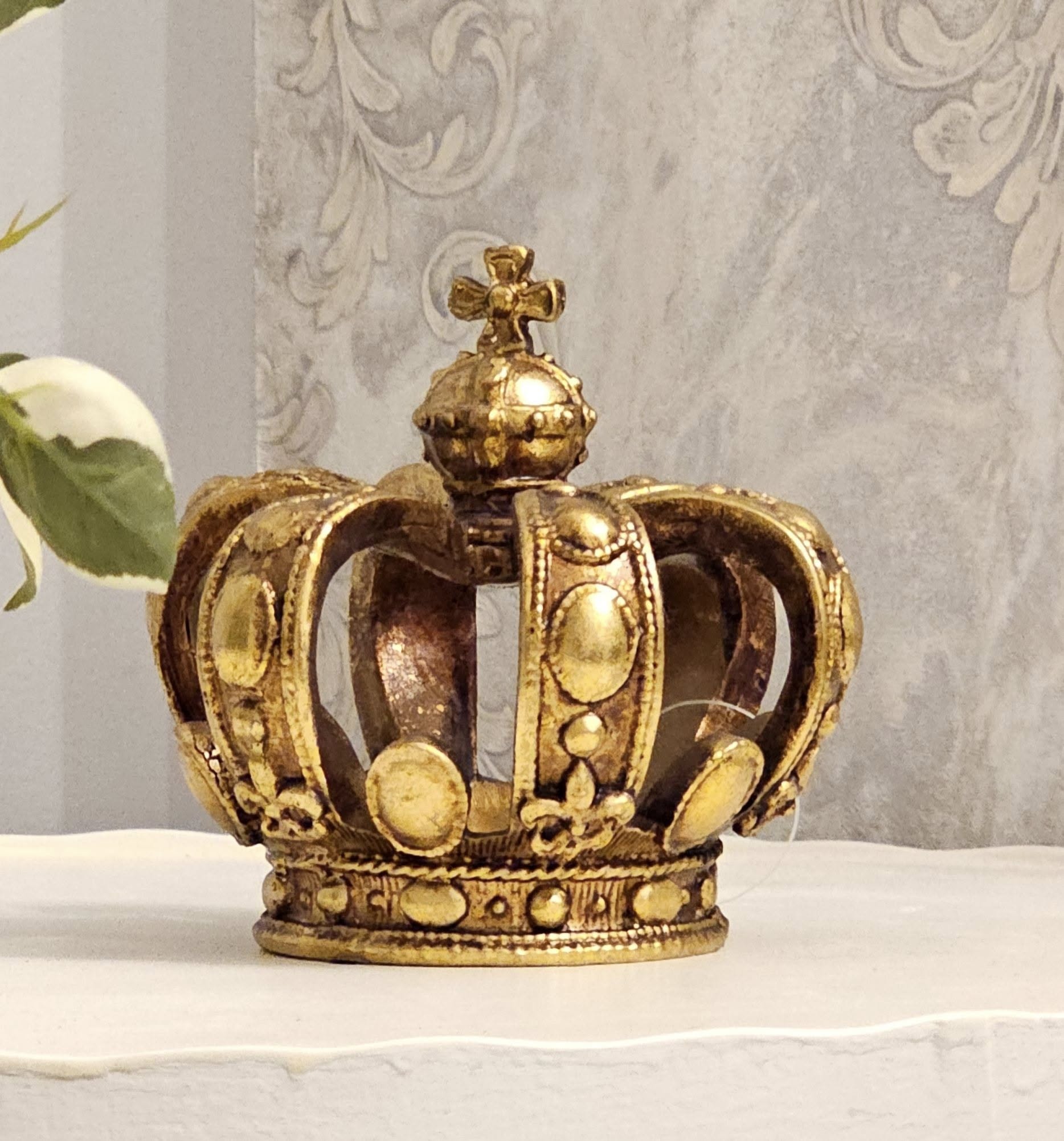 Elevate your home décor with the timeless elegance of this Antique Gold Regal Crown Ornament. Designed to evoke a sense of royal luxury, this ornament features intricate detailing and a rich, vintage-inspired gold finish. Perfect for adding a touch of grandeur to any space, it effortlessly combines classic sophistication with modern charm. Whether displayed on a mantel, incorporated into a holiday centrepiece, or used as a striking accent for special occasions, this crown ornament is sure to be a statement piece. Its regal design and refined craftsmanship make it ideal for those who appreciate the finer things in life. Dimensions: H:11cm W:11.5cm D:11cm