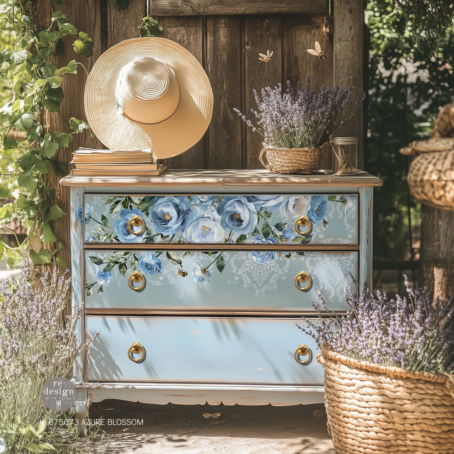 Infuse your furniture and décor with calm elegance using the Azure Blossom Decor Transfer by Redesign with Prima®. Featuring soft blue florals and delicate botanical details, this design brings a fresh, tranquil, and timeless aesthetic to any project. And each transfer is so easy to use: peel off the protective backing, apply the transfer to the prepared surface, rub on the design with the included stick (or use our Transfer Tool), peel off the top sheet (check to make sure the whole design transferred), and burnish to remove any existing halos. Total transfer sheet size 24″x35″, Cut into 3 sheets