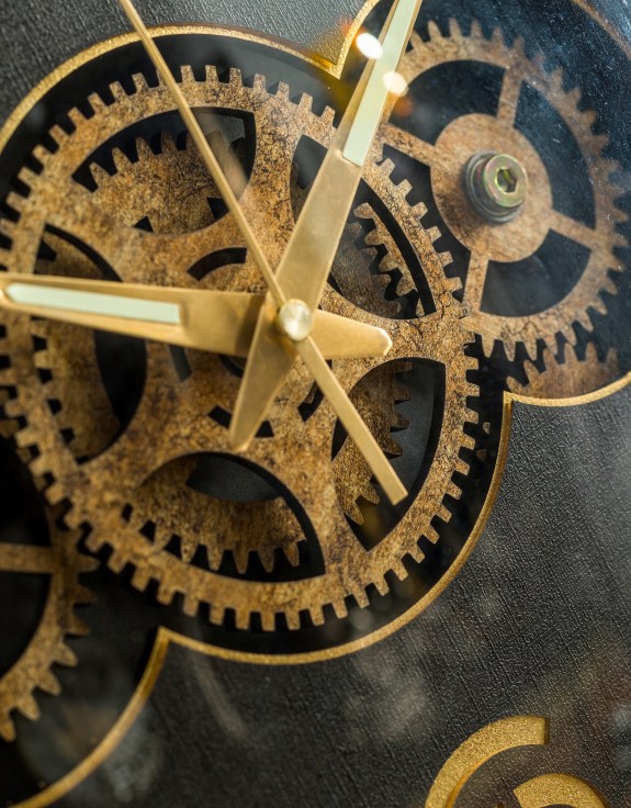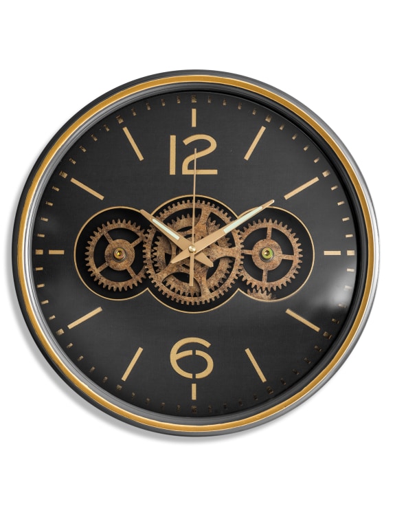 Elevate your home or office decor with our exquisite Black Clock featuring Gold Numerals and Moving Gears. This sophisticated timepiece not only keeps you on schedule but also adds a touch of modern elegance with its sleek black design and gleaming gold numerals. The visible moving gears provide a mesmerizing visual element, making this clock a conversation piece. Enhance your space with the perfect blend of style and function – a clock that’s as much a work of art as it is a timekeeping essential.   Dimensions: H:39cm W:39cm D:9
