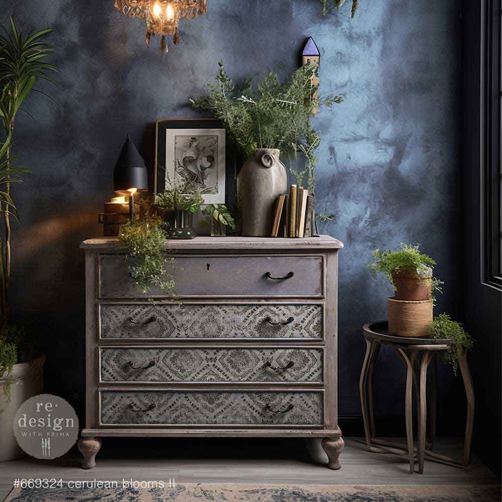Infuse your projects with serene sophistication using Cerulean Blooms II Découpage Paper by Redesign with Prima®. Featuring rich cerulean-blue florals and graceful botanical detailing, this 19″ x 30″ décor tissue paper brings a calming yet striking presence to furniture makeovers, decorative accents, and mixed media art. Measure and cut the desired amount of paper, add Decoupage Gel to the prepared surface, set the paper on top and smooth it with the Scraper Tool or Brayer. Add another layer of Decoupage Gel on top and let it dry. 1 Sheet, Measuring 19.5” x 30”cm