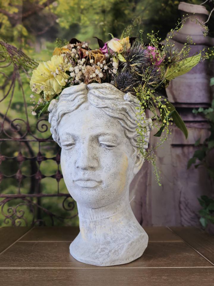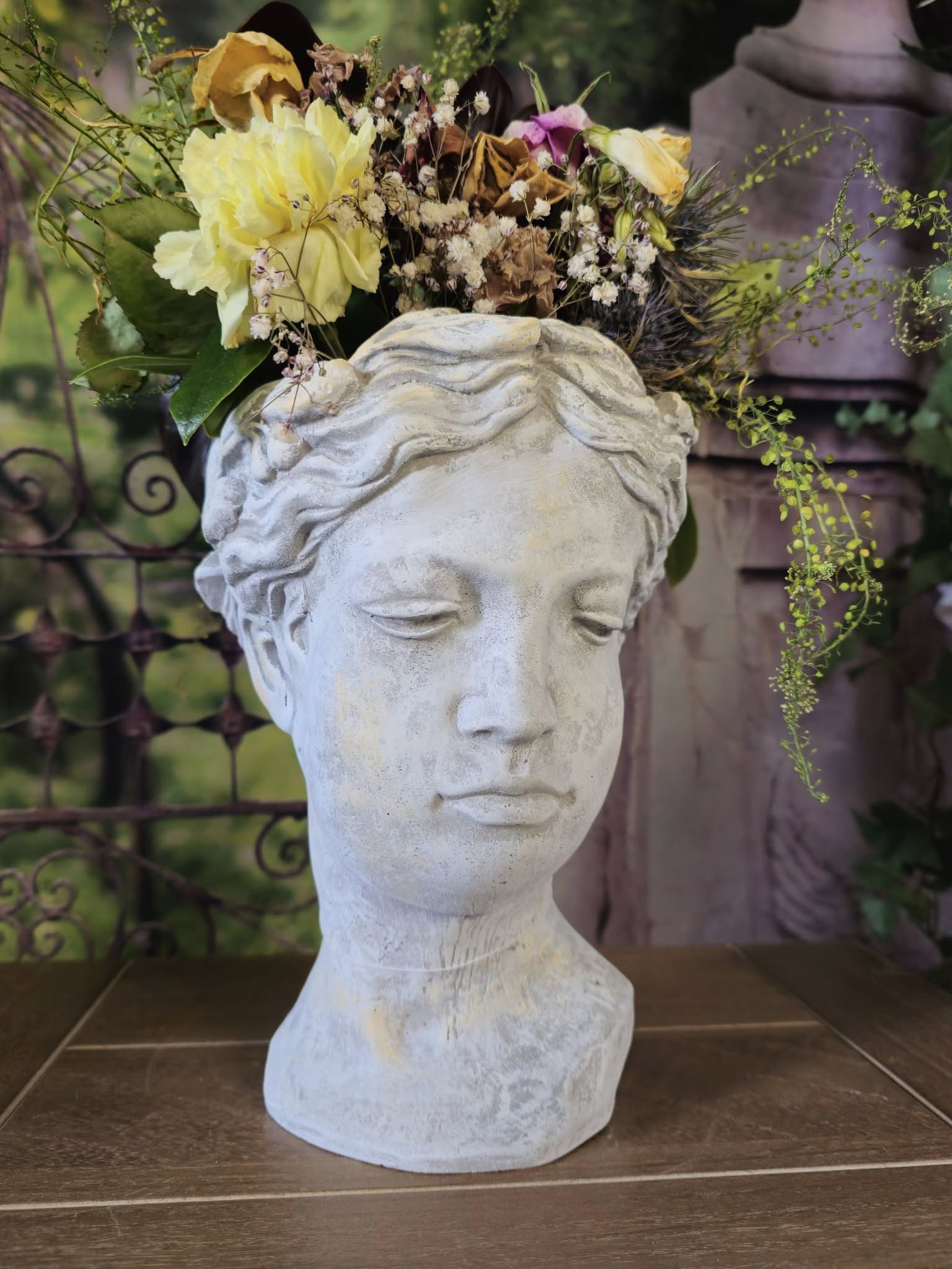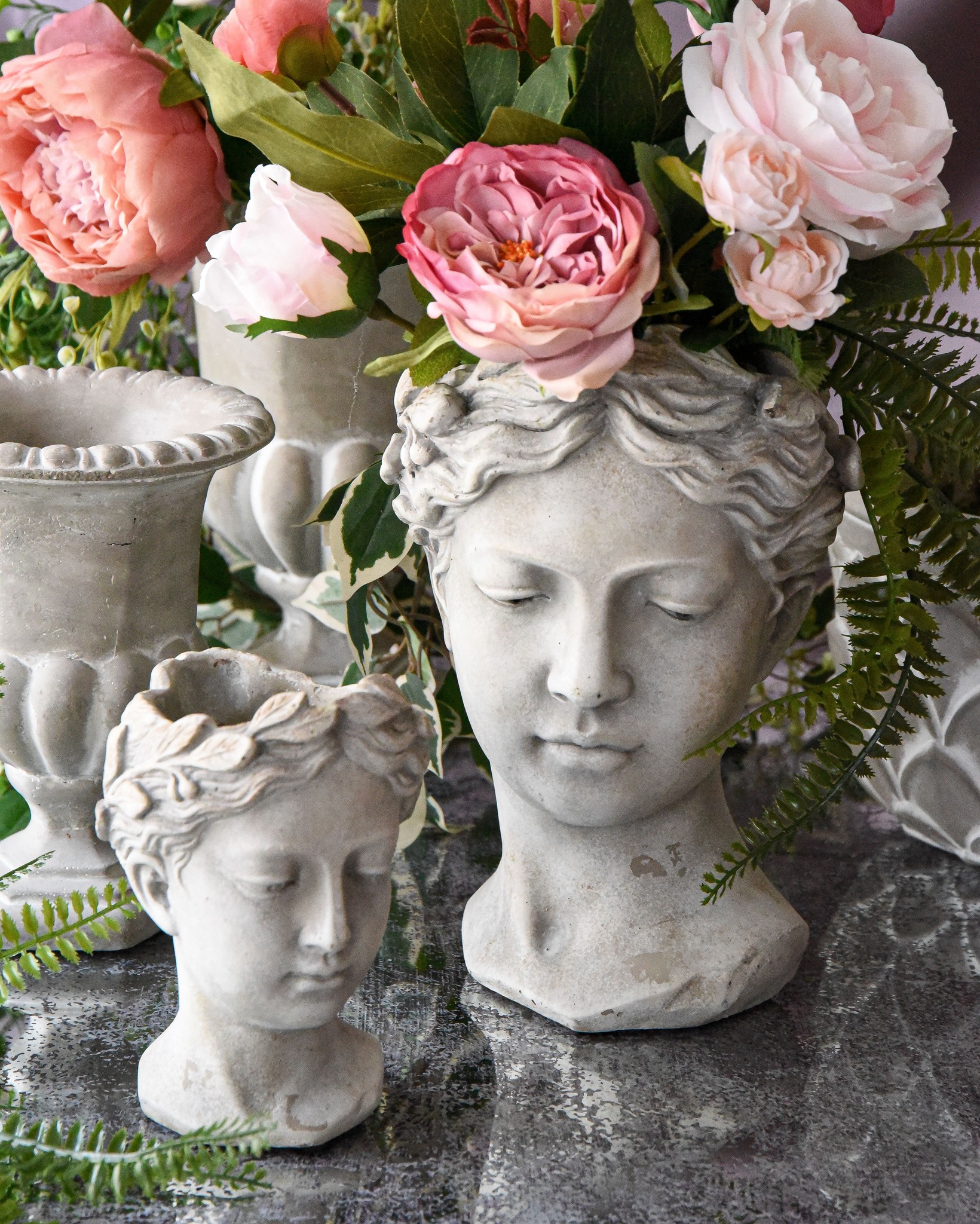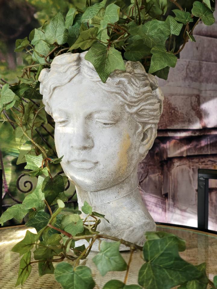 The design usually includes a hollowed-out area, often at the top, serving as the planter where soil and plants can be placed. These planters often add a touch of classical or romantic aesthetics to gardens, patios, or indoor spaces, offering a unique and artistic way to showcase plants while adding a sense of whimsy and elegance to the surroundings.