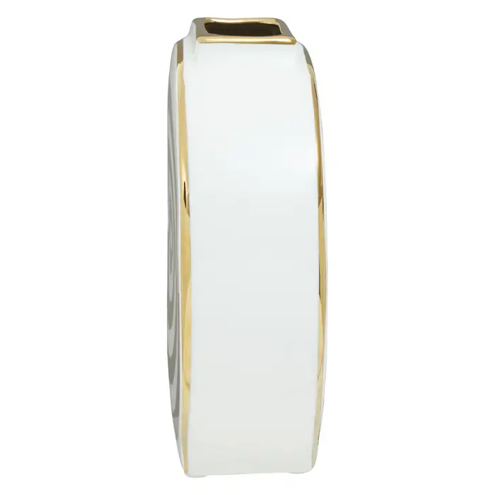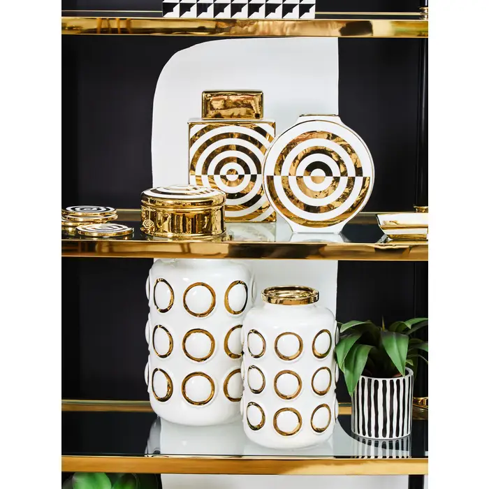 Made from ceramic, this jar has an elegant round shape in a smooth white finish accented with a gold-tone deco fied bullseye design. The sleek trim and narrow opening match the warm metallic detailing and enhance luxe style and sophistication. Dimensions: H21 x D7 x W20cm