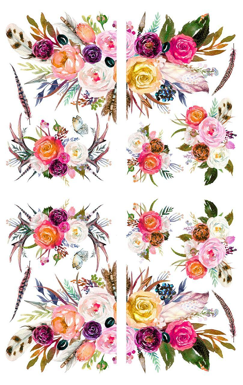 Transform your space with Belles & Whistles Decor Transfer Flower Child—Bright, bohemian pattern. Romantic, soft and delicate buds paired with feathers create a dream piece for all the free-spirited souls.