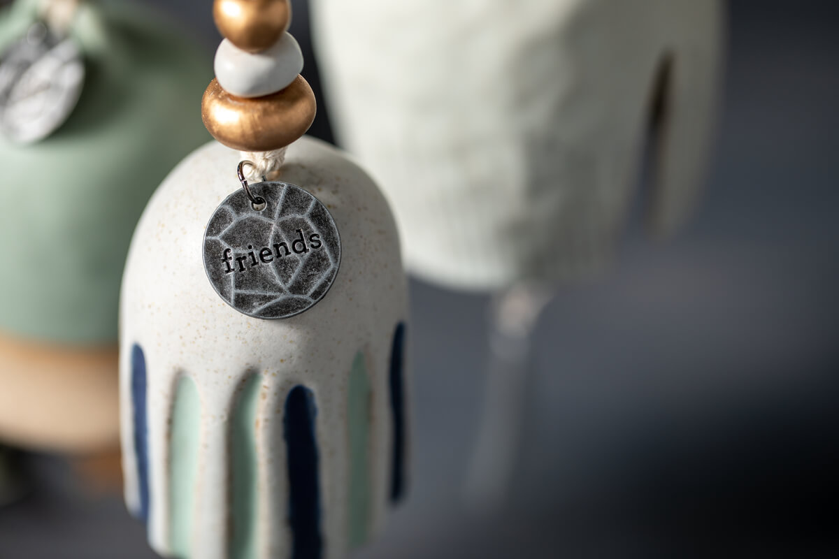 Give beauty and relaxation with our Inspired Bells collection, a selection of artisan bells in soft, serene colors with soothing, gentle rings bearing sentiments of faith and love. Our Inspired Bell – Friends is a ceramic indoor/outdoor bell in white with blue and green stripes. The sentiment on the bell reads, “Friends.” You can give this calming memory bell as a birthday, Cheistmas, anytime, rough times, self-care, or hospital gift. It can be a permanent token of your love. This handcrafted, personal and unique gift can be enjoyed as a relaxing sound in your home or office. Keep one for yourself and give one to your friend. Coming in a set of two this bell is in its own giftbox with a handle and a tag reading a sentimental message