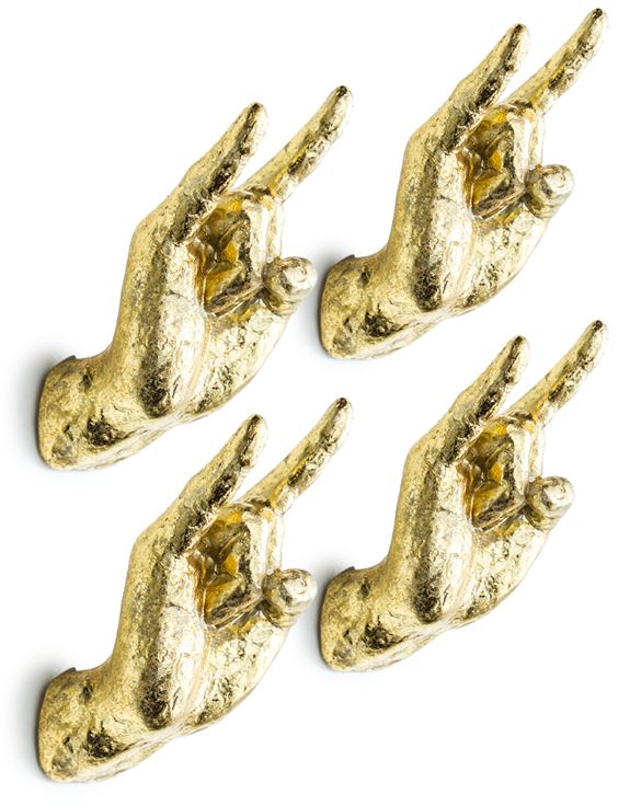 A gold “rock on” wall hook is a stylish and quirky decorative item that adds a touch of personality and flair to your space. This type of wall hook is typically designed to resemble the iconic “rock on” hand gesture (also known as the “devil horns” gesture), with the index and pinky fingers extended while the thumb holds down the middle and ring fingers. Here’s a detailed description: