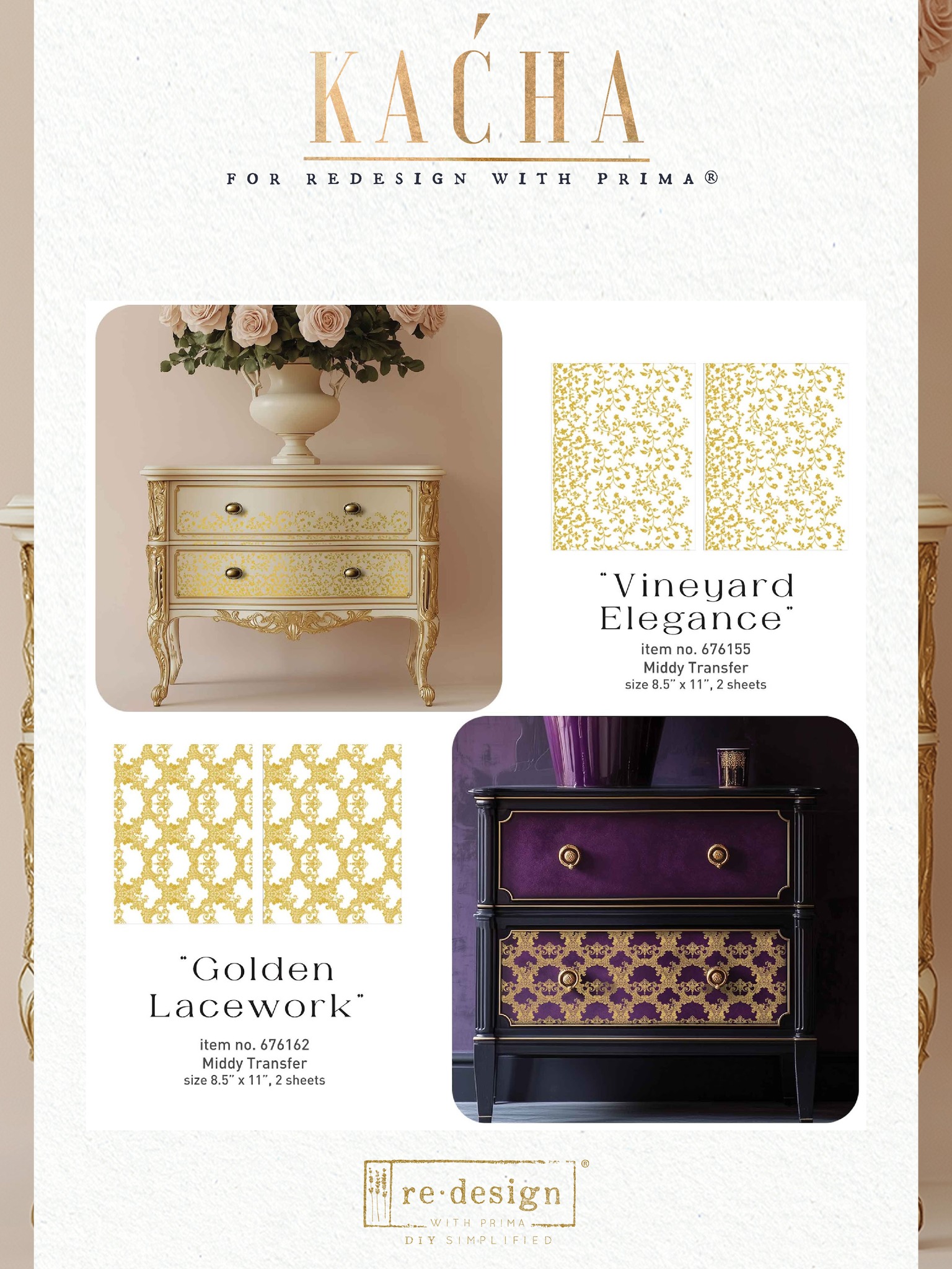 Elevate your furniture with Golden Lacework, Kácha’s exquisite take on intricate detailing. The ornate gold pattern mimics delicate lace, bringing understated luxury to dressers, cabinets, and more. This Middy Foil Transfer design pairs effortlessly with bold jewel tones or soft, neutral palettes, creating a classic yet contemporary look. HOW TO USE: Apply the transfer with care, seal to enhance its richness, and enjoy the timeless elegance of Kácha’s artistry.” “2 sheets, 8.5″x11”