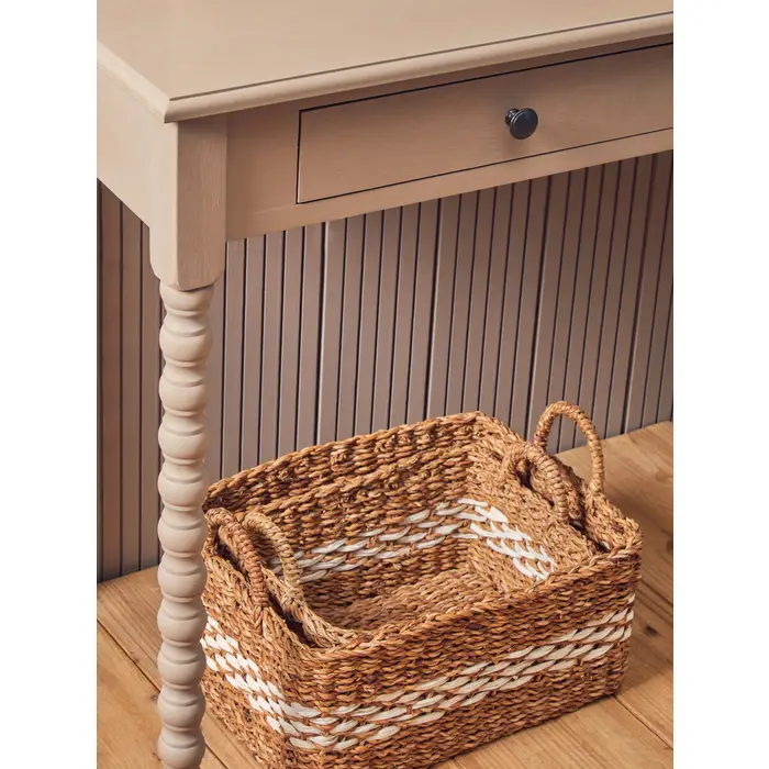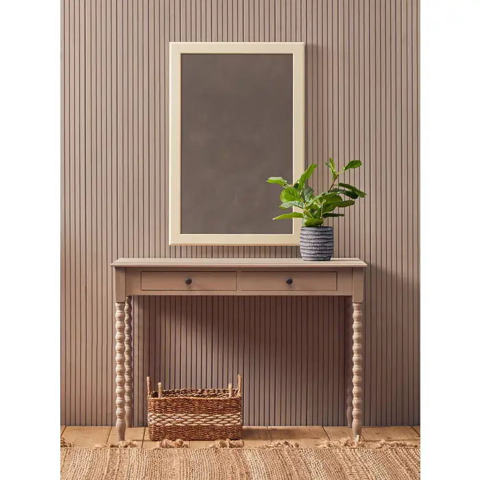 This pine wood rectangular desk is accented in a grey finish and features two drawers for storage. The desk stands on carved spindle legs, which add to its charm. The drawers have metallic silver knob handles which contrast the wood finish. Materials: Pine 60%, Pine 60% Dimensions: H75 x L48 x W107