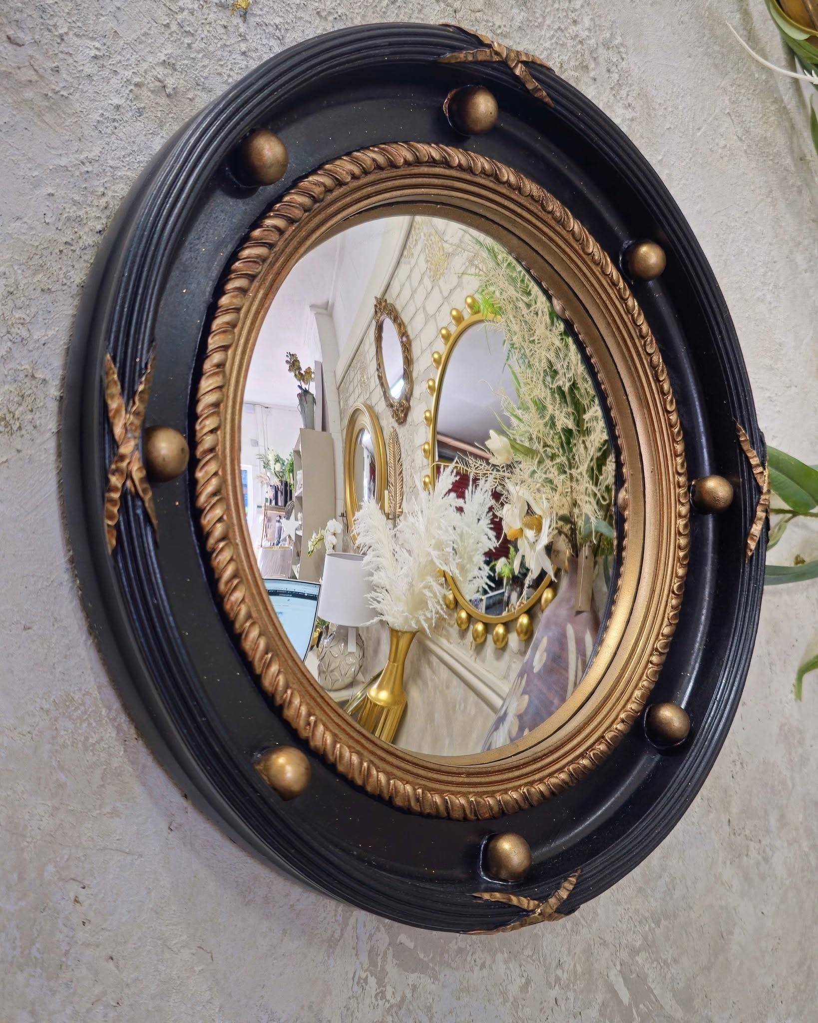 Large Black & Antique Gold Framed Porthole Convex Mirror