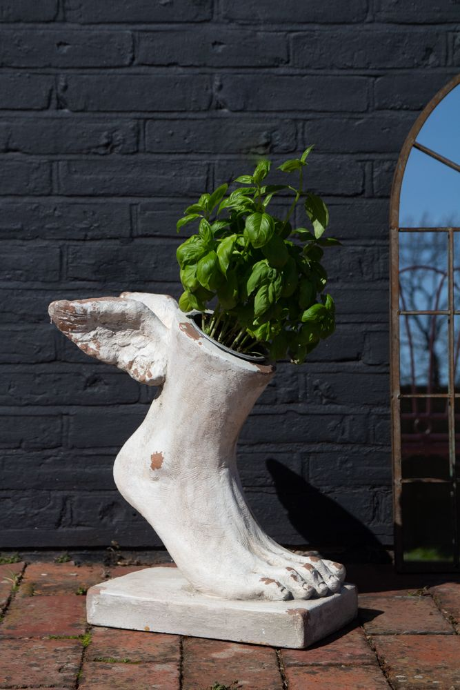Add a touch of ancient myth and rustic charm to your space with our Large Rustic Stone Effect Winged Foot Planter. Inspired by the iconic symbol of Hermes, the Greek messenger god, this unique planter fuses classical art with modern rustic design.
