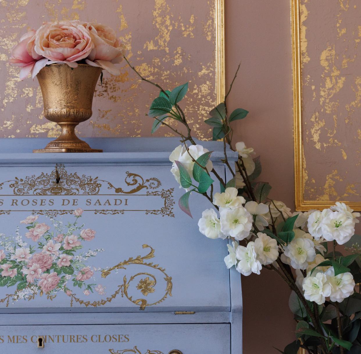 Kacha’s love for golden details and beautiful flowers is expressed perfectly in her new Décor Transfer, “Les Roses”. Romantic French script intertwines beautifully with fresh pink roses and trendy golden details. Décor Transfers® are incredibly easy to use. Simply peel off the backing paper, lace the transfer onto your desired surface, and rub it with the included tool to transfer the design. The transfer can be cut and rearranged to fit your specific needs, making it a versatile and customizable choice for all your Décor projects. Seal with your favorite water-based sealer or clear wax.