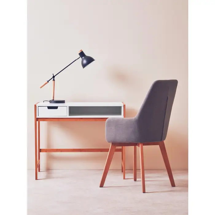 This sleek and sophisticated table lamp is crafted from iron and rubberwood. The minimalist industrial structure is adjustable and features a two-tonal combination of natural and matte black accents.   Materials: Plastic 5%, Iron 50%, Iron 50% Dimensions: H57 x L16 x W68