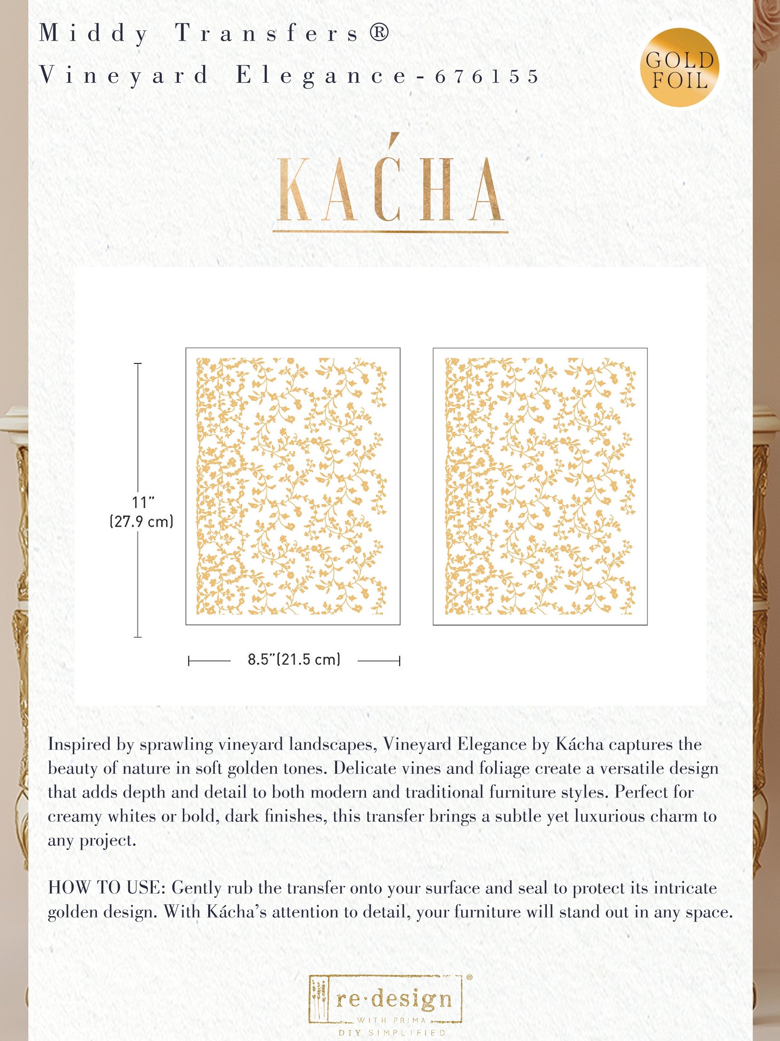Inspired by sprawling vineyard landscapes, Vineyard Elegance by Kácha captures the beauty of nature in soft golden tones. Delicate vines and foliage create a versatile Middy Foil Transfer design that adds depth and detail to both modern and traditional furniture styles. Perfect for creamy whites or bold, dark finishes, this transfer brings a subtle yet luxurious charm to any project. 2 sheets, 8.5″x11″ –